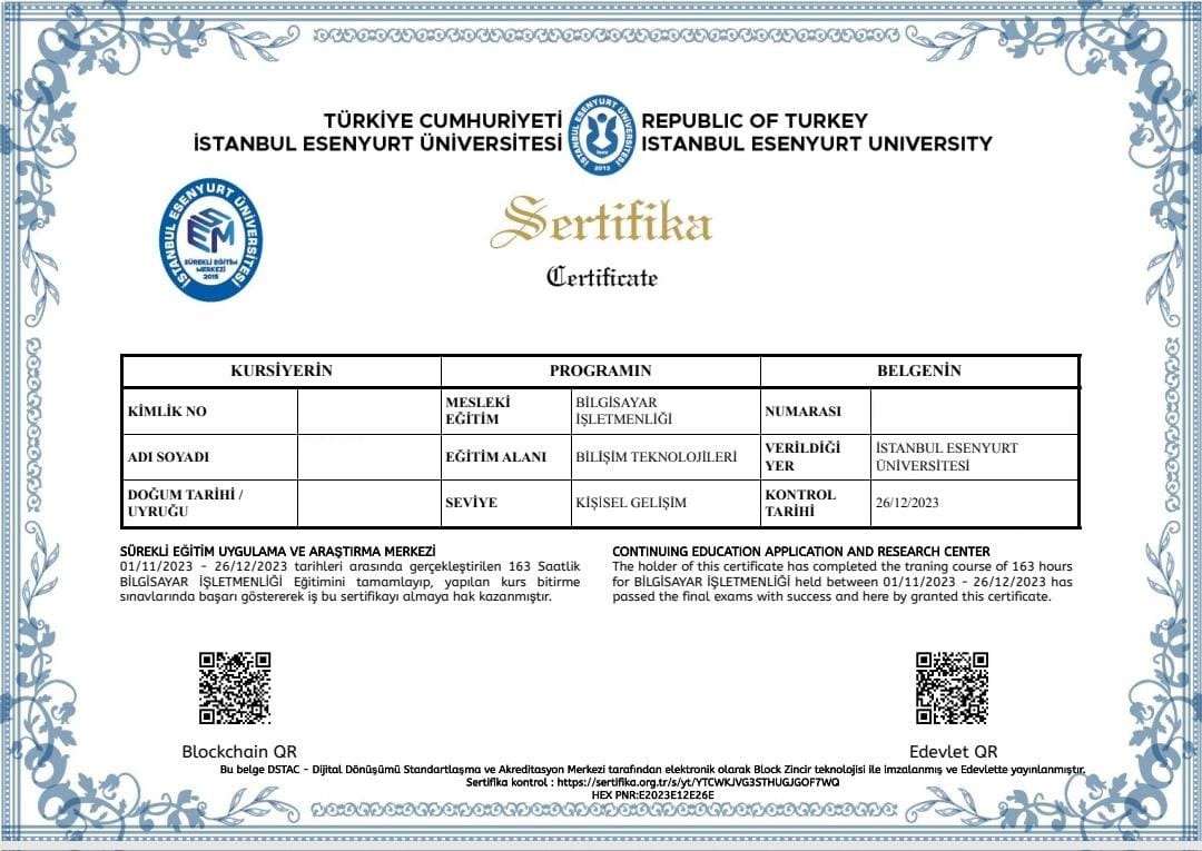 Eğitim bitiminde uygulanan sınavın ardından eğitim programına katılan adaylara Eğitim sertifikalarını vererek kolaylıkla bu alanda iş yaşamına atılmalarına destek olmaktayız.