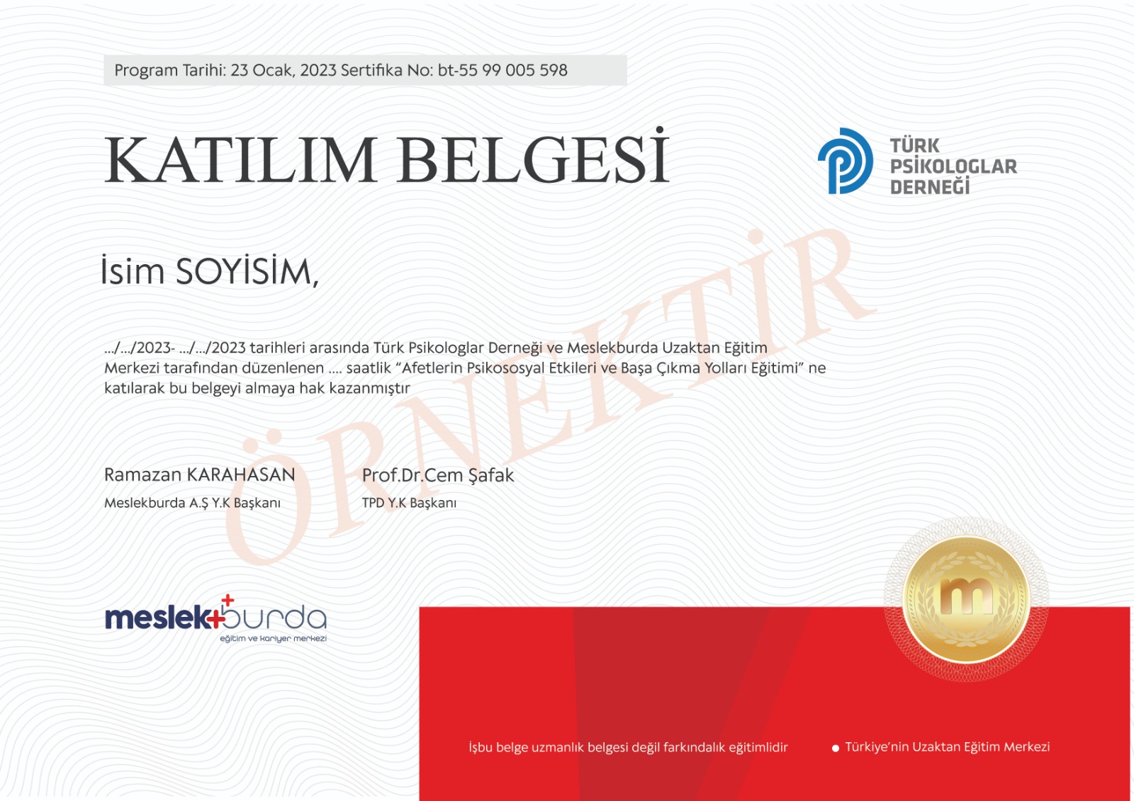 Evet, eğitimin %90'ının tamamlayan katılımcılara Meslekburda ve Türk Psikologlar Derneği tarafından imzalanmış online "Katılım Belgesi" verilmektedir. Bu belge farkındalık eğitimine katıldığınızı göstermektedir. Herhangi bir uzmanlık, ünvan, mesleki deneyim kazandırmaz.